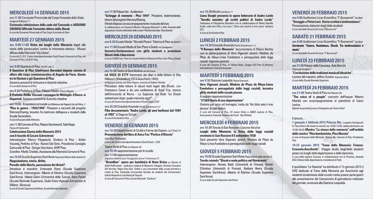 Numerosi gli eventi che Pisa organizza nel 2015 per tenere vivo il ricordo, insieme a un folto numero di realtà. “Questi numeri – ha detto l’assessora Marilù Chiofalo – parlano di una città intera che si muove e che, utilizzando i vari e diversi strumenti di comunicazione e linguaggi a nostra disposizione, creano un unico multiforme programma. Pisa non Dimentica incontra la Giornata della Memoria e lo fa con molti appuntamenti” che non si limiteranno solo al 27 gennaio.