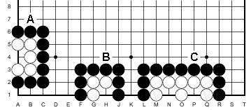 se Nero cattura in A1 si crea un Ko. B: se Nero gioca in H1 Bianco cattura con G1 e si crea un Ko. C: se Nero cattura giocando O3 non è Ko, Bianco può subito ricatturare (una singola pietra) giocando in N3
