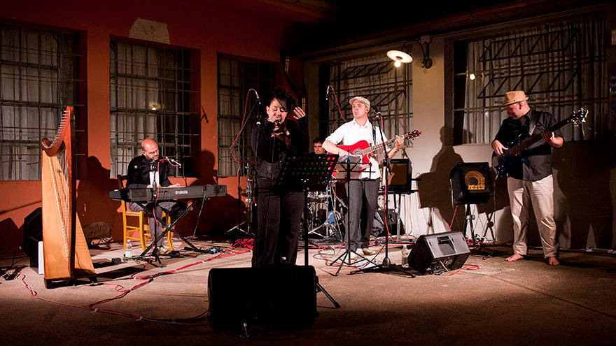 Lo spettacolo di lunedì 30 Giugno, organizzato dalla Città del Teatro di Cascina nel cortile interno del teatro, si è distinto per il grande coinvolgimento emotivo che si è instaurato fin dal primo brano tra gli astanti e gli Actias Luna che, attraverso la voce narrante di Riccardo, hanno spiegato il loro “sogno di un viaggio diverso”. Penso sia stata l’unica volta in cui di fronte a un artista che si dilunga in spiegazioni non ho sentito il bisogno di gridare “sòna!”, non tanto per l’ambiente teatrale in cui ci trovavamo, quanto per la ricchezza di ogni parola pronunciata, che letteralmente ha accompagnato tutti nella comprensione di storie mai banali, alcune sepolte nella storia d’Italia, altre ancor più indietro, nel mito, altre ancora palpitanti in varia misura attorno a noi.