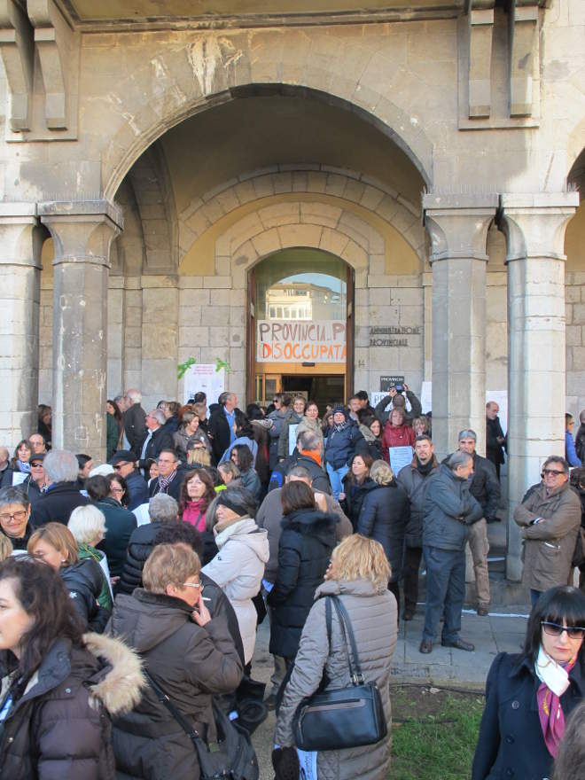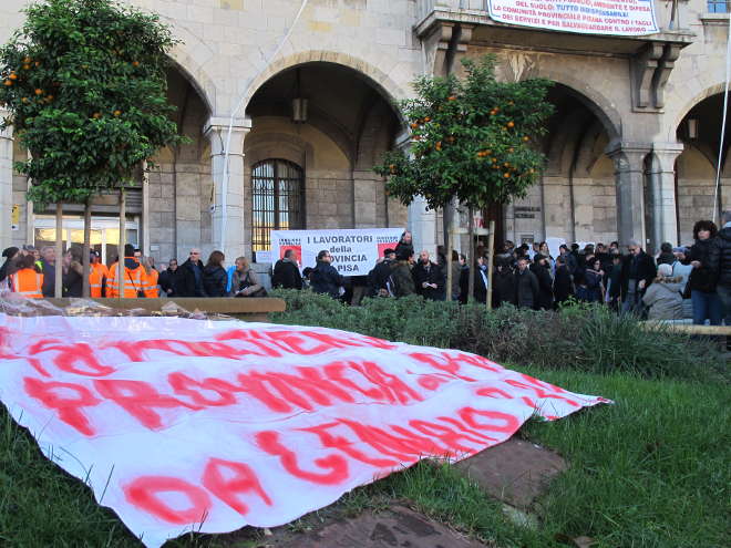 Presidio alla sede della Provincia di Pisa, dove circa 300 lavoratori si sono mobilitati contro le riduzioni del personale e i tagli previsti dalla Legge di Stabilità in discussione in queste ore. Un’occupazione che continuerà fino a domani perché a rischio ci sono 250 posti di lavoro a cui si sommano quelli dei servizi in appalto alle cooperative sociali, portineria (18 posti), pulizie e altri servizi. Ma anche la manutenzione del territorio, delle scuole, delle strade, quelle funzioni insomma che fino ad oggi erano assegnate alla Provincia e che con la riforma Del Rio dovranno essere riassegnate.