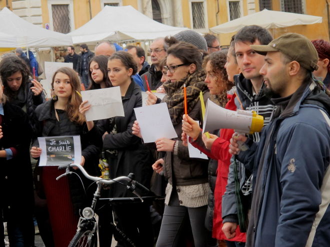 Un centinaio di persone si sono trovate ieri in piazza dei Cavalieri, a partire da una convocazione spontanea su Facebook, per manifestare solidarietà al popolo francese per quanto accaduto nella redazione di Charlie Hebdo.