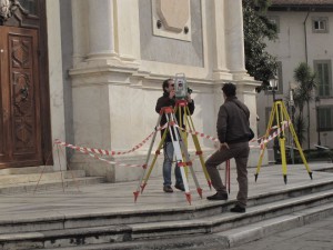 Oltre al georadar il laser scanner consente di mappare la superficie e gli edifici. Paolo Capraro della Eurotec ci spiega come: “Lo strumento che usiamo è una stazione totale Leica Ts 50, una stazione robotica che in pratica insegue un prisma, in questo caso posto in cima al georadar, catturandone le esatte coordinate e le relative immagini. In questo modo i dati raccolti sottoterra possono essere localizzati grazie al laser scanner che agisce in superficie. E in modo estremamente puntuale perché lo scanner ha una precisione di 0,6 mm”.