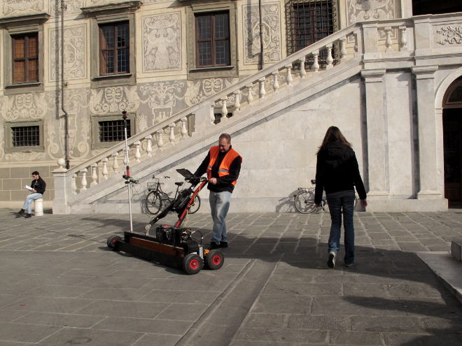 Gianfranco Morelli, direttore tecnico della Geostudi, spiega che lo strumento utilizzato per la scansione del sottosuolo viene già utilizzato in archeologia o per il ritrovamento di bombe. L’innovazione è nella modalità del trasporto: montato infatti su un carrello della larghezza di due metri, lo si può spostare agevolmente e consente la scansione di grandi spazi in poco tempo: “Per piazza dei Cavalieri abbiamo impiegato poco più di due ore. Per piazza del Campo solo 5 ore”. Dà inoltre una resa precisa di ciò che “vede” sotto terra: “I dati vengono prima raccolti poi elaborati da un software e uniti insieme alla mappatura esterna degli edifici e della piazza”.